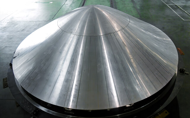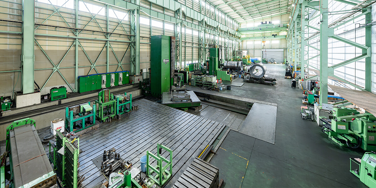 姫路工場には5~50トンのクレーン群を、高砂工場には国内でも数少ない150トンクレーンを備え、重量物の高精度曲面加工に対応。長年培った技術と高剛性の設備によって、精密かつ安定した大型加工を実現しています。